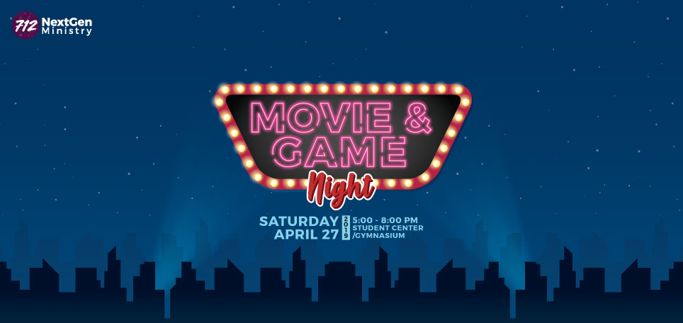 You are invited to our NG712 Movie & Game Night at the Student Center/Gymnasium on April 27, Saturday from 5:00 PM to 8:00 PM.