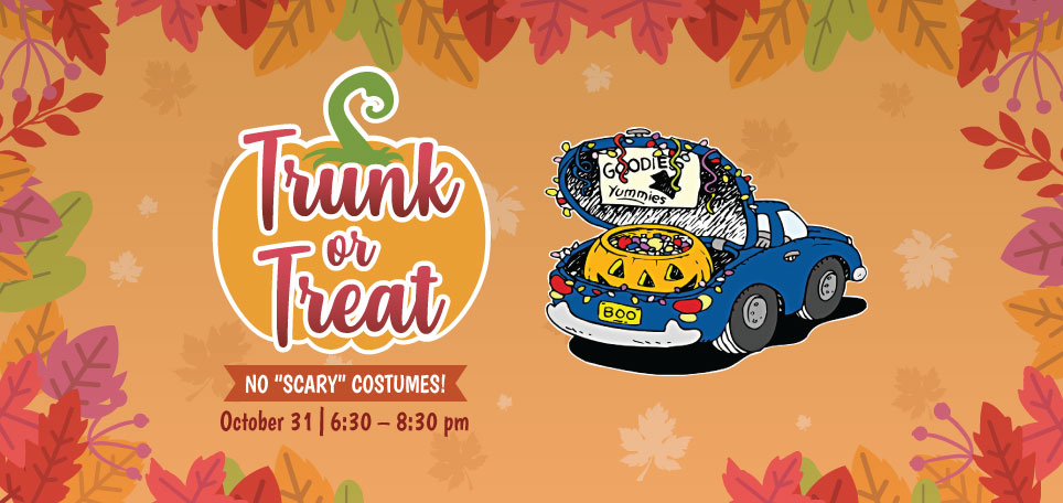 Trunk or Treat! Peek-a-boo! No Scary Costumes! Drive thru the fun on Thursday, October 31 from 6:30 to 8:30 PM Enjoy exciting activities like face painting, treats, hot chocolate, baked goods and